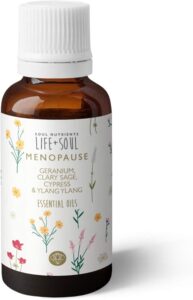 Mezcla específica con geranio, salvia clara, ylang‑ylang y ciprés, formulada para equilibrar emociones y aliviar síntomas comunes durante la menopausia.